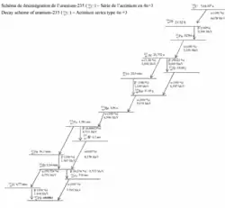 On peut utiliser le schéma de désintégration pour représenter une famille radioactive complète, par exemple à droite celle de l'uranium-235. Dans ce cas, le schéma est généralement simplifié, et par exemple omet les rayonnements gamma par désexcitation, ce qui peut conduire à croire faussement qu'il n'y a pas de rayonnement gamma émis dans la chaîne alors que ce type de rayonnement accompagne une grande partie des désintégrations alpha.