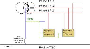 - Le coût d'un schéma de liaison à la terre TN-C est moindre car le conducteur de protection équipotentiel "PE" et conducteur neutre "N" sont confondus ce qui nous donne un conducteur "PEN" (économie d'un câble et d'un pôle des protections surintensité). Ce conducteur "PEN" est en priorité un conducteur de protection avant d'être un conducteur neutre, il ne doit pas être coupé afin d'assurer la protection des personnes.