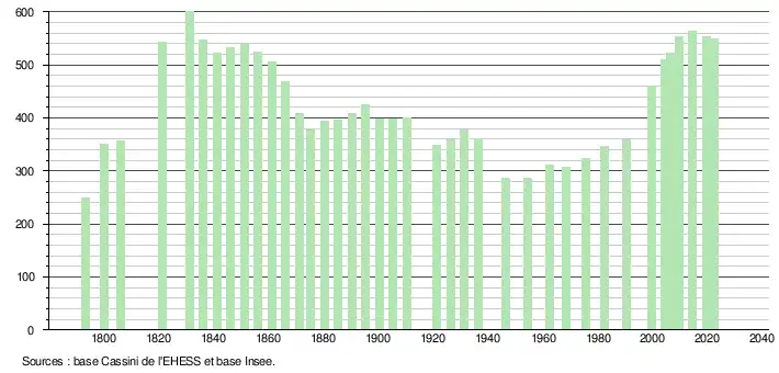 L'évolution du nombre d'habitants est connue à travers les recensements de la population effectués dans la commune depuis 1793. Pour les communes de moins de 10 000 habitants, une enquête de recensement portant sur toute la population est réalisée tous les cinq ans, les populations de référence des années intermédiaires étant quant à elles estimées par interpolation ou extrapolation[18]. Pour la commune, le premier recensement exhaustif entrant dans le cadre du nouveau dispositif a été réalisé en 2004[19].