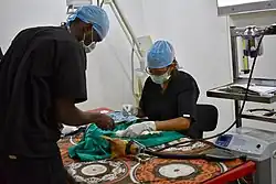 Les vétérinaires courent des risques professionnels tel que blessures (morsures, griffures et coupures), zoonotiques, radiologique et de burn-out[47].