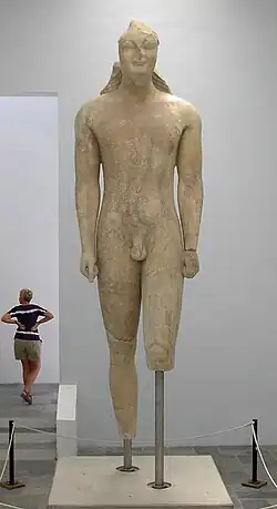 Des statues colossales, autour de 600-570, semblent se mesurer aux productions égyptiennes, mais l'absence du support qui part du dos jusqu'au socle et que l'on trouve dans la statuaire égyptienne, en pierre, laisserait supposer que les sculpteurs grecs n'avaient pas vu leurs modèles et qu'ils s'appuyaient sur des descriptions de non-spécialistes[46]. La fragilité de ces statues, sur leurs deux seules jambes va poser de sérieux problèmes aux sculpteurs grecs, et aux naxiens en particulier. Presque toutes ces statues sont brisées à hauteur des chevilles. Les premiers kouroi, du cap Sounion[47], sont très proches par l'attitude du petit bronze dédalique de Delphes, probablement crétois, mais sans l'échelle colossale et en bronze.