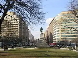 Dès ses débuts, la sculpture américaine fut immanquablement influencée par la sculpture européenne. En témoignent les nombreuses statues équestres. Ce furent d'abord bien évidemment les grands personnages de l'histoire américaine qui furent l'objet de cette représentation. Bien vite cependant, plusieurs artistes américains sont allés parfaire leurs connaissances et leur technique auprès de grands maîtres en Europe si bien qu'imprégnés de la culture de ce continent, ils ne purent restés insensibles au désir de retrouver sur le sol américain des représentations de personnages qui marquèrent l'histoire européenne. Aux côtés des George Washington[77], James Garfield[78], Nathanael Greene[79], et de bien d'autres apparurent dans la capitale américaine les Christophe Colomb[80], Dante Alighieri[81], Isabelle Ire de Castille[82], Martin Luther[83]... Les personnages de la France furent parmi les premiers à connaître cet honneur avec, entre autres, le marquis Gilbert de Lafayette[27] et Louis Daguerre[84] qui firent leur apparition au début de la décennie 1890 alors que la plupart de ces grandes figures européennes devront attendre le XXe siècle.