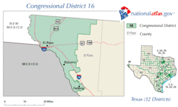 Le 16e district congressionnel du Texas comprend la quasi-totalité d'El Paso et la plupart de ses banlieues dans l'État du Texas. La représentante actuelle est la Démocrate Veronica Escobar.