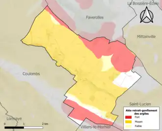 Le retrait-gonflement des sols argileux est susceptible d'engendrer des dommages importants aux bâtiments en cas d’alternance de périodes de sécheresse et de pluie. 87,5 % de la superficie communale est en aléa moyen ou fort (52,8 % au niveau départemental et 48,5 % au niveau national). Sur les 274 bâtiments dénombrés sur la commune en 2019, 242 sont en aléa moyen ou fort, soit 88 %, à comparer aux 70 % au niveau départemental et 54 % au niveau national. Une cartographie de l'exposition du territoire national au retrait gonflement des sols argileux est disponible sur le site du BRGM[15],[Carte 2].