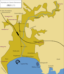 - (en) Cet article est partiellement ou en totalité issu de l’article de Wikipédia en anglais intitulé « Kamakura's Seven Entrances » (voir la liste des auteurs).