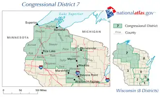 Le 7e district congressionnel du Wisconsin est un district situé dans le nord-ouest et le centre du Wisconsin ; c'est géographiquement le plus grand district de l'État, couvrant 20 comtés (en tout ou en partie), pour un total de 18 787 milles carrés. Le district comprend les comtés suivants : Ashland, Barron, Bayfield, Burnett, St. Croix, Chippewa (partiel), Clark, Douglas, Florence, Forest, Iron, Jackson (partiel), Juneau (partiel), Langlade, Lincoln, Marathon, Monroe (partiel), Oneida, Polk, Price, Rusk, Sawyer, Taylor, Vilas, Washburn et Wood (partiel).