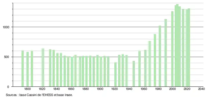 L'évolution du nombre d'habitants est connue à travers les recensements de la population effectués dans la commune depuis 1793. Pour les communes de moins de 10 000 habitants, une enquête de recensement portant sur toute la population est réalisée tous les cinq ans, les populations de référence des années intermédiaires étant quant à elles estimées par interpolation ou extrapolation[27]. Pour la commune, le premier recensement exhaustif entrant dans le cadre du nouveau dispositif a été réalisé en 2004[28].