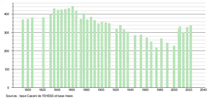 L'évolution du nombre d'habitants est connue à travers les recensements de la population effectués dans la commune depuis 1793. Pour les communes de moins de 10 000 habitants, une enquête de recensement portant sur toute la population est réalisée tous les cinq ans, les populations de référence des années intermédiaires étant quant à elles estimées par interpolation ou extrapolation[27]. Pour la commune, le premier recensement exhaustif entrant dans le cadre du nouveau dispositif a été réalisé en 2007[28].