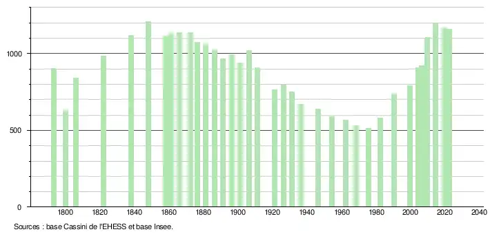L'évolution du nombre d'habitants est connue à travers les recensements de la population effectués dans la commune depuis 1793. Pour les communes de moins de 10 000 habitants, une enquête de recensement portant sur toute la population est réalisée tous les cinq ans, les populations de référence des années intermédiaires étant quant à elles estimées par interpolation ou extrapolation[10]. Pour la commune, le premier recensement exhaustif entrant dans le cadre du nouveau dispositif a été réalisé en 2004[11].
