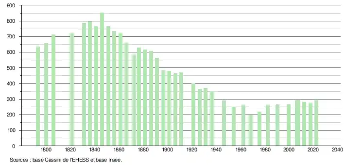 L'évolution du nombre d'habitants est connue à travers les recensements de la population effectués dans la commune depuis 1793. Pour les communes de moins de 10 000 habitants, une enquête de recensement portant sur toute la population est réalisée tous les cinq ans, les populations de référence des années intermédiaires étant quant à elles estimées par interpolation ou extrapolation[14]. Pour la commune, le premier recensement exhaustif entrant dans le cadre du nouveau dispositif a été réalisé en 2007[15].