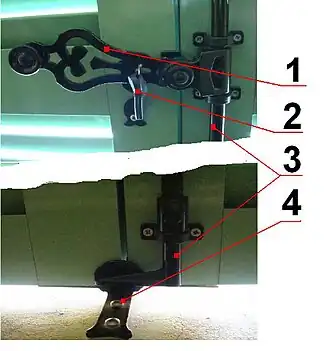 Espagnolette de volet extérieur: 1=poignée pivotante ou main tournante, 2=mentonnet de poignée, 3=tige pivotante terminée par un crochet soudé, 4=gâche fixe ou butée de volet