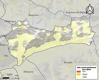 Le retrait-gonflement des sols argileux est susceptible d'engendrer des dommages importants aux bâtiments en cas d’alternance de périodes de sécheresse et de pluie. 0,5 % de la superficie communale est en aléa moyen ou fort (44,5 % au niveau départemental et 48,5 % au niveau national). Sur les 101 bâtiments dénombrés sur la commune en 2019, 1 sont en aléa moyen ou fort, soit 1 %, à comparer aux 75 % au niveau départemental et 54 % au niveau national. Une cartographie de l'exposition du territoire national au retrait gonflement des sols argileux est disponible sur le site du BRGM[41],[Carte 2].