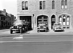 Pompiers à bord d’un camion d’incendie devant la caserne 27, rue Gatineau à Montréal, le 15 septembre 1947.Caserne 27: 5353, rue Gatineau, Côte-des-Neiges 45° 29′ 51″ N, 73° 37′ 19″ O