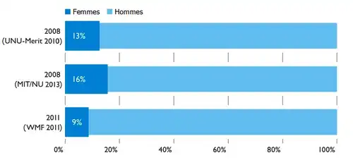 Cette tendance est confirmée avec l’enquête générale de la fondation auprès de la communauté en 2011, qui trouve une proportion de femmes à 9 % au niveau mondial et 15 % aux États-Unis[4],[5]. Une autre étude dirigée par Judd Antin et publiée la même année examine les genres déclarés des comptes enregistrés sur Wikipédia en anglais, et trouve une proportion de 82 % d’hommes et 18 % de femmes[6]. La même année, une équipe de recherche dirigée par Nicolas Jullien trouve des résultats similaires auprès des personnes contribuant à Wikipédia en français, avec 80 % d’hommes, et 86 % chez les personnes contribuant régulièrement[7]. Cette proportion semble stable dans le temps[8].