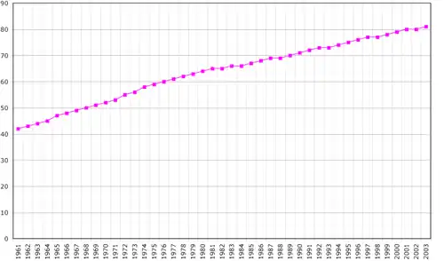 Avec une population estimée à 96 387 habitants en 2021[31], les Seychelles ont une croissance démographique positive (0,8 %), tirée par l'immigration et une natalité dynamique. Environ 33 des 115 îles de l'archipel sont habitées et, en 2013, seules 12 d'entre-elles comptaient plus de 20 habitants, Mahé concentrant à elle seule près de 87% de la population[32].