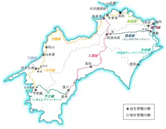La JR Shikoku possède un réseau de 855,2 km. Contrairement à d'autres compagnies de la Japan Railways, la JR Shikoku a arrêté la classification des "lignes principales" dans l'appellation de ses lignes en 1988. Avant ce changement les lignes Dosan, Kōtoku, Tokushima et Yosan étaient classifiées en ligne principales.