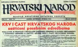 Les Oustachis orchestrent d'emblée une propagande antisémite intense. Le lendemain de la signature des principales lois raciales (), l'organe du mouvement oustachi, le Hrvatski narod (« Nation croate ») titre en grands caractères : « Le sang et l'honneur du peuple croate protégés par des clauses spéciales »[22].