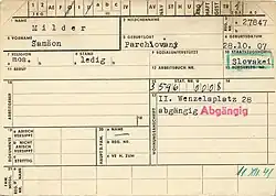 En janvier 1940, l'Office central de Prague voit sa juridiction étendue à l'ensemble du protectorat et, en mars, il exerce son contrôle sur toutes les communautés juives ; toutes les personnes catégorisées comme « juives » selon les lois de Nuremberg ont ordre de s'y inscrire, même si elles ne sont pas membres de la communauté juive. La liberté de circulation des Juifs est restreinte par un couvre-feu imposé après huit heures du soir et le gouvernement Hácha leur interdit de se rendre dans les cinémas et les théâtres. Les cartes d'identité délivrées aux Juifs par le protectorat portent la lettre « J » en rouge[65]. À la mi-1940, les Juifs ne peuvent faire leurs courses que pendant une tranche horaire stricte et, le , ils n'ont plus accès aux écoles ; ces deux interdictions émanent du gouvernement tchèque[66],[67].
