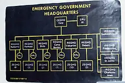 | Zone Emergency Government Headquarters | ZEGHQ | Construit dans les sous-sols de bâtiments existants ou nouveaux, conçu pour accueillir jusqu'à 70 personnes. |