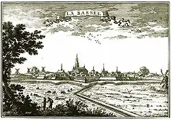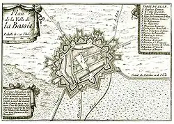 Pendant la guerre franco-espagnole de 1635-1659, La Bassée est une place forte des Pays-Bas espagnols. Elle sert de refuge aux villageois des environs et à leurs troupeaux menacés par les incursions de l'armée française. Elle repousse un coup de main français le et, après la prise d'Arras par les Français en 1640, les Espagnols renforcent ses remparts mais, le , le maréchal de La Meilleraye s'en empare après huit jours de siège. La garnison, forte de 1 800 hommes, obtient de se retirer avec les honneurs de la guerre[20]. Les États des Pays-Bas, excédés par les pillages des Français, demandent au gouverneur espagnol Francisco de Melo de reprendre La Bassée et lui offrent un subside de 80 000 florins. Melo se met en campagne avec 5 régiments espagnols, 3 italiens et 5 wallons ; il reprend Lens le , puis La Bassée, qui se rend le après 24 jours de siège ; la garnison française, commandée par le capitaine Bourdonnet, évacue la place avec les honneurs[21].