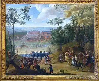 C'est le dernier siège auquel Louis XIV, âgé de 53 ans, assiste en personne et il fait l'objet d'une publicité étendue pour rehausser la gloire du souverain : Te Deum dans toutes les villes de France, inscriptions et médailles, comptes-rendus imprimés dans la Gazette de France et le Mercure Galant[13]. Les toiles commandées à Jean-Baptiste Martin, Sébastien Leclerc, comme la gravure réalisée par Nicolas Langlois, mettent en valeur la figure triomphale du roi[13].
