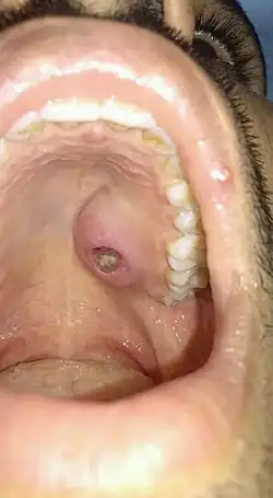 La sialométaplasie necrosante est une lésion salivaire inflammatoire bénigne. Elle s'observe habituellement chez un homme d'environ 40 ans dans les glandes salivaires du palais, essentiellement du palais dur ou à la jonction palais dur-palais mou. Elle est d'évolution lente, de résolution le plus souvent spontanée, en 1 à 3 mois.