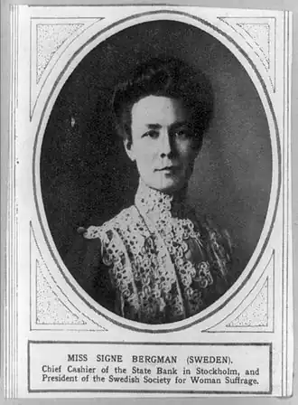 Signe Bergman devient officiellement présidente en 1914. En 1917, la majorité des partis au Parlement sont favorables au vote des femmes. Néanmoins, le droit de vote est encore rejeté, ce qui l'amène à démissionner de son poste. Il est finalement adopté en 1919.
