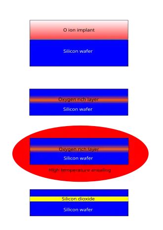 La mise en œuvre est délicate car il faut respecter la continuité du substrat de silicium. L’idée consiste à faire naître l’isolant à l’intérieur du silicium par une technique dénommée SIMOX (ou Separation by IMplantation of Oxygen, une injection à très haute température d’oxygène purifié)[7].