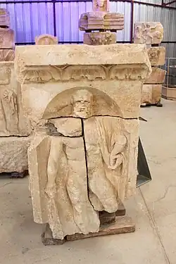 Un ensemble de stèles funéraires a également été mis au jour, contre un mur. La plupart des stèles ne sont pas sculptées mais deux d’entre elles représentent des bustes ; une troisième représente une femme portant trois tuniques et une serviette sur l’épaule.