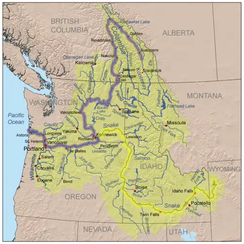 Bassin versant de la Snake River (avec celui du Columbia en pâle). | |