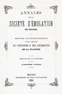 - Charles van Renynghe de Voxvrie, « Les revues historiques des Flandres ». I. La Société d'Emulation pour l'histoire et les antiquités de la Flandre Occidentale, dans : Tablettes des Flandres, T. I, Bruges, 1948, pp. 199-219.