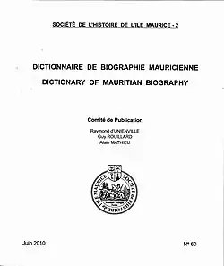 - Le Dictionnaire de Biographie Mauricienne (DBM), dont le premier numéro est paru en 1941 sous la direction d'Auguste Toussaint[3], avec une préface en français et en anglais d'Alfred de Simard de Pitray, président de la SHIM. Les biographies de 42 personnes y étaient évoquées. Par la suite les publications se succèderont régulièrement sous la direction du chercheur-archiviste Noël Regnard de 1952 à 1972 et de Raymond d’Unienville[n 2] depuis 1973. Un comité de rédaction participe aux éditions dont : Louis Hallais, Guy Rouillard[n 3], P.J. Barnwell[n 4], Alain Mathieu[n 5], Philippe La Hausse de La Louvière[n 6], et plus récemment Anne Goupille. Ainsi 65 publications ont été réalisées et plus de 2 400 vies de personnes liées à l'Ile Maurice ont pu être diffusées en français, mais aussi en anglais.