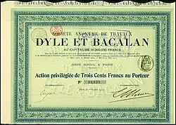 La Société de travaux Dyle et Bacalan est issue de la fusion des Ateliers de la Dyle fondés à Louvain en Belgique et de la Société des chantiers de Bacalan créée à Bordeaux en 1869[2]. Le siège de la société se trouve à Paris, 15 avenue Matignon.