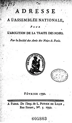 - ↑ Société des Amis des Noirs et des colonies (France), Adresse à l'Assemblée nationale pour l'abolition de la traite des noirs, par la Société des amis des Noirs, de Paris. Février 1790 : XVIIIe – XXe siècle : 1790-1993, Lille, Imprimerie de L. Potier de Paris, (lire en ligne).(BNF 36400188). Reproduction de l'édition de, Paris, l'imprimerie de L. Potier de Lille, 1790. 22 p., (BNF 37237548)
