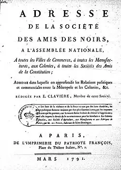 - ↑ Étienne Clavière, Adresse de la Société des amis des Noirs à l'Assemblée nationale, à toutes les villes de commerce, à toutes les manufactures, aux colonies, à toutes les sociétés des amis de la constitution, adresse dans laquelle on approfondit les relations politiques et commerciales entre la métropole et les colonies, etc. : XVIIIe – XXe siècle : 1791-1991, Paris, Editions, (lire en ligne).(BNF 36400239). Reprod. de l'édition, rédigée par Étienne Clavière pour la Société des amis des Noirs, Paris, de l'imprimerie du patriote françois, 1791. VII-128 p., (BNF 37243734).