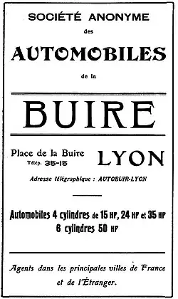 La Société des automobiles de la Buire est créée à Lyon le [1]. Elle est une filiale de la Société Nouvelle des Établissements de l'Horme et de la Buire.