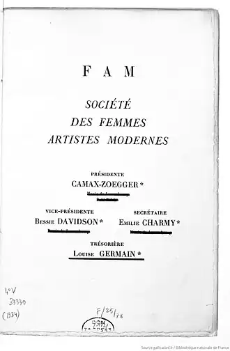 - ↑ Paula J. Birnbaum, « The Exhibitions of the Femmes Artistes Modernes (FAM), Paris, 1931-38 - résumé », sur awarewomenartists.com, .