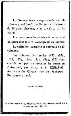 - 1 2 Source : Table des chansons et poésies diverses publiées par la Société du Caveau de 1861 à 1868 suivie de la Table des chansons sur les mots donnés de 1843 à 1867, par G. Bouclier, Membre Titulaire, Paris, Imprimerie de Jules-Juteau et fils, 1868.
