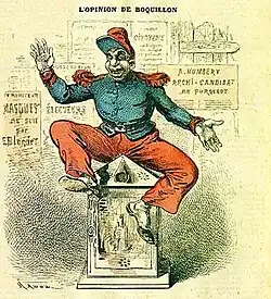 - ↑ Dessin extrait de : Les Fredaines de la chanson. Souvenir de Pomponne-les-Bois, 20 août 1876, éditeur : imp. de Vve Ethiou-Pérou et A. Klein, Paris 1877, page 18. La même page reproduite dans Commons.