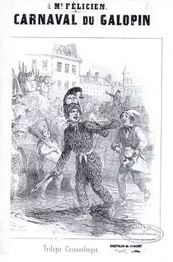 - 1 2 Cette Trilogie Carnavalesque consiste en une alternance de morceaux parlés et chantés. Les paroles sont de Ernest Bourget, la musique de A. Marquerie. Cette œuvre a été écrite pendant la période d'activité parisienne de Philippe Musard (1830-1854). Elle compte 4 pages imprimées plus une page illustrée de couverture, où figurent deux personnages costumés et derrière eux le défilé de la Promenade du Bœuf Gras.