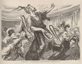 - ↑ Extrait du chapitre VII : Les Sociétés de l'ouvrage anonyme Physiologie de l'Opéra, du Carnaval, du Cancan et de la Cachucha, par un vilain masque. Dessins de Henri Emy, Raymond-Bocquet Éditeur, Paris 1842.