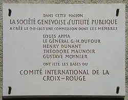L’une des plus importantes créations de la Société genevoise d’utilité publique est celle du Comité international de la Croix Rouge. Ce comité a été inspiré par l’ouvrage d’Henri Dunant, Un souvenir de Solférino, paru en 1862 et dans lequel, après une longue description de la bataille de Solferino sur le lieu de laquelle il s’est rendu, Dunant propose « la création de sociétés de secours dans chaque pays qui, lors des conflits armés, pourraient venir en aide aux victimes des combats et un texte de droit visant à protéger les blessés de tous les camps et la protection de ceux chargés de les soigner ». Cet ouvrage enthousiasme Gustave Moynier qui le soumet au comité de la SGUP le . Sans succès. Moynier décide alors de créer une commission d’étude de 5 membres qui se réunit pour la première fois le et prend le nom de Comité international permanent de secours aux militaires blessés. Il sera reconnu officiellement à l’issue de la Conférence internationale de Genève tenue le et présidée par Gustave Moynier[10].