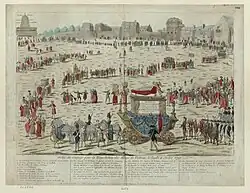 Panckoucke s'adresse d'abord à Frédéric II de Prusse, qui fut un temps le correspondant et l'ami de Voltaire, mais n'obtient aucune réponse[110][111]. Il propose alors à Catherine II, qui avait acquis la bibliothèque de Voltaire, de financer une partie de l'édition, en échange de la remise des manuscrits. La réponse — positive — met six mois à venir[110]. Entre temps, Panckoucke, qui avait besoin du soutien du gouvernement pour le lancement de son Encyclopédie méthodique, a cédé ses droits à Beaumarchais. Le 25 février 1779[112] celui-ci lui rachète les manuscrits de Voltaire pour la somme de 300 000 livres[d], montant revu à la baisse par un avenant du 27 novembre 1786[31].