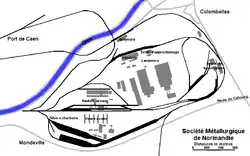 En 1912, la déclaration d'utilité publique pour l'établissement d'un chemin de fer minier entre l'usine et les mines du sud de Caen, notamment celles de Saint-Germain-le-Vasson et Potigny, est signée ; la voie site propre à écartement standard longue de 29 km n'ouvre qu'en 1920[12]. L'usine disposait de sa propre gare de marchandise dont le poste de contrôle se situait à Colombelles. Une autre gare, dite de Clopée, assurait la liaison entre le chemin minier, le port privé de la SMN et le réseau ferré de l'État[13]. Le port de la SMN est également relié au chemin de fer minier de Caen à Soumont-Saint-Quentin[14].