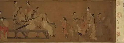 Les historiens remarquent que les femmes durant la dynastie Tang sont hardie, sûres d'elles-mêmes, actives et relativement plus libérées socialement que les femmes de la dynastie Song[156]. Selon l'historien Gernet, sous le règne des Song, elles sont en général plus cultivées et plus enclines à s'exprimer intimement à travers la poésie[157], mais sont en revanche plus réservées, respectueuses, minces, petites et menues[156],[158]. L'apparition de la mode des pieds bandés durant les Song du Sud renforce certainement cette vision[159]. Toutefois, un grand nombre de documents révèlent une réalité bien plus riche et complexe sur la vie de famille et des femmes[157]. À travers les romans et registres légaux entre autres documents, différentes sources montrent que les femmes Song ont une grande influence dans les prises des décisions familiales et sont familières avec l'économie du ménage[160],[161]. Les hommes dominent la sphère publique, pendant que les femmes influentes passent leur temps à la maison à jouir de loisirs et à gérer le foyer[161]. Toutefois, les femmes des classes moyennes et basses ont une influence qui se borne uniquement à la sphère domestique[157],[161]. Par ailleurs, il est commun de rencontrer des femmes tenancières d'auberges de ville ou de restaurants, des filles de fermiers tisser des tapis et les vendre, des sages-femmes faire des accouchements, des nones bouddhistes étudier les textes religieux et les sûtras ou encore des femmes surveiller de près leurs propres intérêts financiers[161],[162]. Dans ce dernier cas, les registres légaux décrivent des cas de veuves sans enfants accusant leurs neveux de voler leurs biens[162]. Il est également plusieurs fois fait mention de femmes s'appuyant sur leurs dots pour aider les sœurs de leur mari à se marier à d'autres familles influentes[162].
