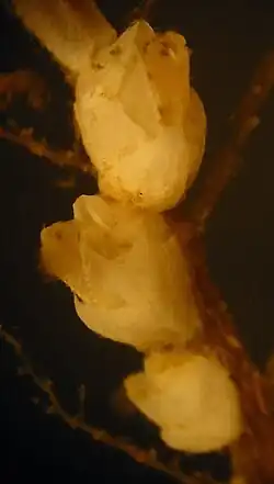 Caractère très particulier, elle ne se fixe pas sur les roches mais principalement sur les coquilles du bivalve Aequipecten opercularis, les coquilles de Buccinum undatum habitées par le pagure Eupagurus bernhardus, la cuticule de l'araignée de mer Maia squinado, de celle u Homard européen (Homarus gammarus) et de certains cnidaires dont la gorgone Eunicella verrucosa, ainsi que sur divers objets en matière plastique, dont les casiers à crustacés[3],[6].