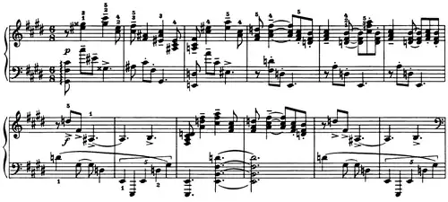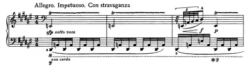 Mes. 1-3. Thème Allegro impetuoso. Toutes les notes appartiennent à une échelle diationique, mais la notion de tonalité n'est pas claire.