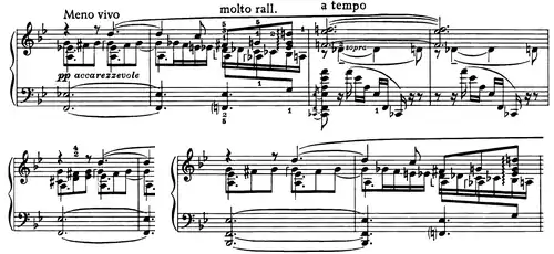 120-139 Le second thème débute mesure 120. Marqué meno mosso, il est en si bémol majeur et de forme binaire.