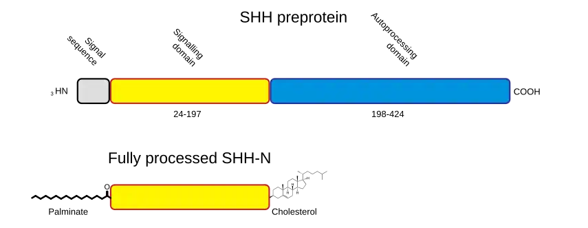 Durant cette réaction, un intermédiaire thioester va être formé. Celui-ci va subir une attaque nucléophile de la part d’une molécule de cholestérol, entrainant l’attachement du cholestérol au C-Terminal de Shh-N [5]. Cette molécule de cholestérol permet l’ancrage de Hh-N à la surface de la cellule. Quand exprimée dans des cellules d’insectes ou de mammifères, la protéine Shh-N est soumise à une seconde modification lipidique: l’introduction du palmitoyl sur l’alpha-amine du N-terminal cystéine. L’activité biologique de cette forme «palmytilée» peut être 30 fois supérieure à la forme «non-palmytilée» [6]. Shh-N ainsi modifiée est responsable de la totalité des activités signalisatrices identifiées pour les protéines Shh[7].