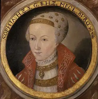 Sophie est morte quelques jours après la naissance de son fils, avant que son mari ne soit devenu électeur. Elle est enterrée dans l'église de la ville de sainte-Marie à Torgau. La médaille de bronze de sa pierre tombale est conçue par Peter Vischer l'Ancien dans son atelier de Nuremberg, d'après un dessin de Jacopo de' Barbari.